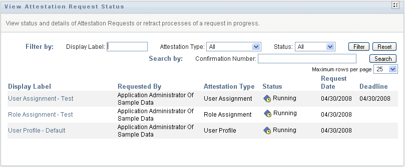 The User Application does not place any restrictions on what the Compliance Module Administrator and Attestation Manager can see on the View Attestation Request Status page. Both of these roles permit access to status information about all attestation requests.