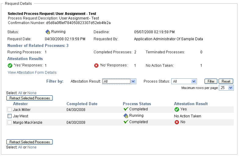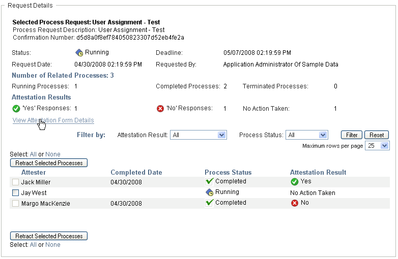 The action lets you see the status of your attestation requests. In addition, it gives you the option to see the detailed status for each workflow process started for a request and optionally retract one or more running processes.
