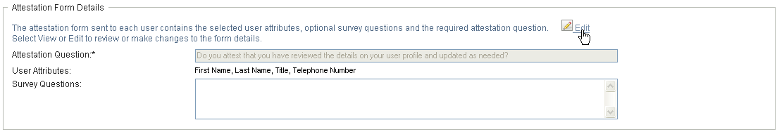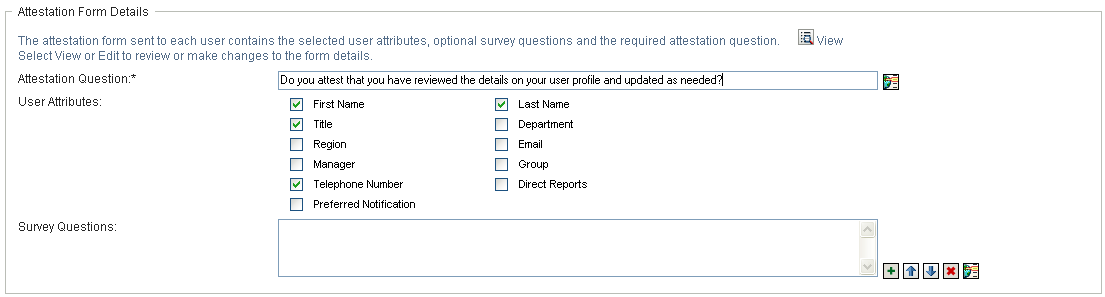 In the field, you can optionally include one or more questions that an attester can answer during the execution of an attestation process. An attestation process is not required to include survey questions. However, if they are included, they may optionally be answered by the attester.