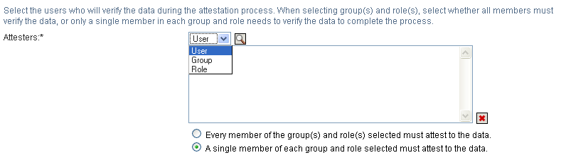 In the field, specify which users, groups, and roles will be attesters for the attestation process: