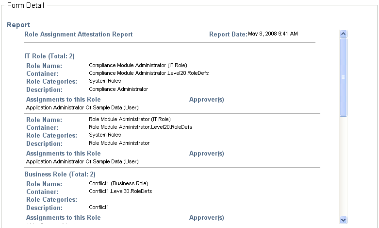 For role assignment, user assignment, and SoD attestation processes, the form includes a report that shows the data you need to review: