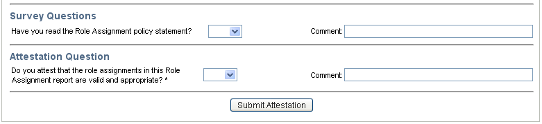 For all attestation types, the form shows controls that allow you to answer the required attestation question, as well as any additional survey questions included in the attestation process: