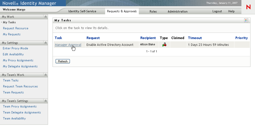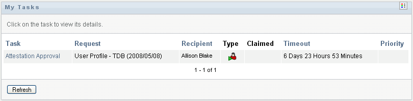 For resource and role requests, the column in the task list specifies the user(s) or group(s) that will receive the resource or role in the event that the required approvals are given. For attestation requests, the column specifies the name of the attester, which is the same as the name of the individual currently logged on to the User Application.