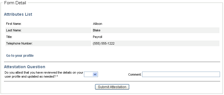 For attestation requests, the section of the page is updated to include the attestation form. The appearance of the form varies, depending on the attestation type. For user profile attestation processes, the form shows the user profile data you need to review: