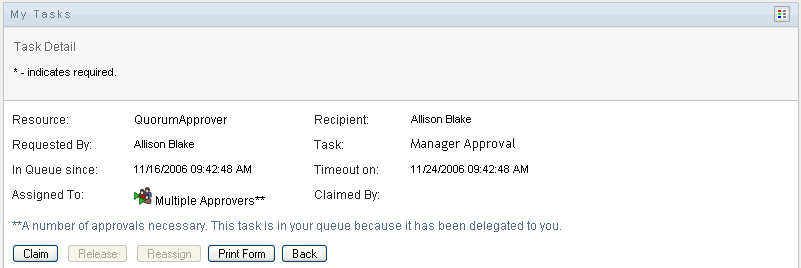 If the approval type is multiple approvers, the task has been assigned to several addressees, and all of the addressees must claim and approve the task.