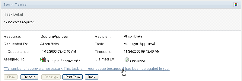 When a task is assigned to multiple approvers, the Task Detail form displays the icon next to the field, and displays text below the icon to indicate that multiple approvals are necessary.