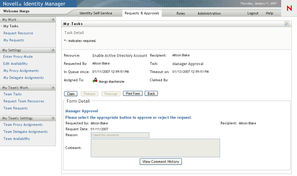 The action allows you to work on workflow tasks associated with resource requests, role requests, and attestation requests. In some cases, the user interface may differ depending on which type of workflow task you select to work on. For attestation requests, the action shows only those tasks for which you are designated as an attester.