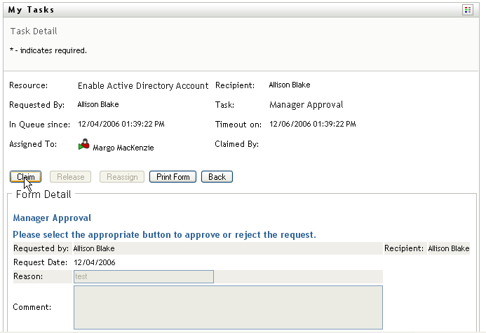 When you claim a task associated with a resource request or role request, you have the ability to take an action that forwards the workitem to the next activity within the workflow. The actions you can perform are described below: