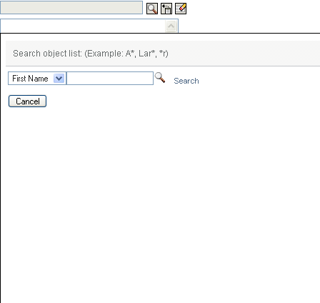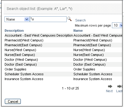 In the text box next to the drop-down list, type all or part of the search criteria (such as name or description). The search finds every occurrence of the type of object you are searching for that begins with the text you type. You can optionally use the asterisk (*) as a wildcard in your text to represent zero or more of any character. For instance, all of the following examples find the role Nurse: