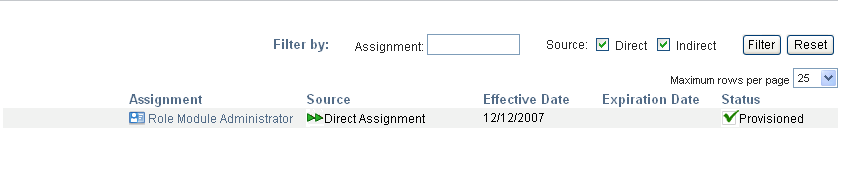 NOTE:A filter on Role Name does not limit the number of objects returned from the Identity Vault. It simply restricts the objects displayed on the page based on the filter criteria. Other filters (such as Status) do restrict the number of objects returned from the Identity Vault.