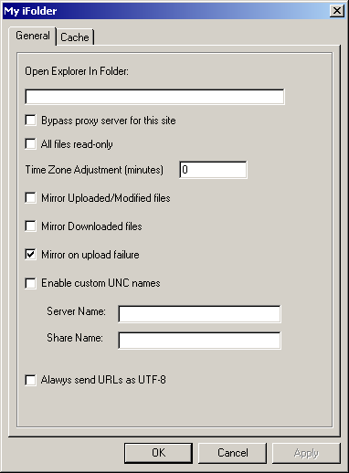 If the NetDrive site connects to an iFolder server, NetDrive opens the iFolder Site Advanced Settings dialog box, shown below. In this dialog, click the different tabs to configure General and Cache parameters.