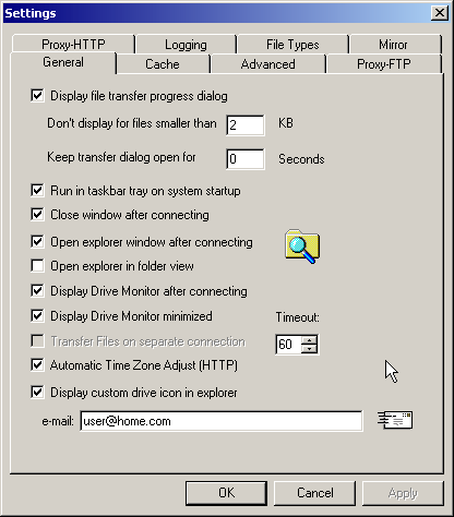 This opens a General Settings dialog box for the selected NetDrive site. In this dialog, click the different tabs to configure General, Cache, Advanced, Proxy-FTP, Proxy-HTTP, Logging, File Types, and Mirror parameters.