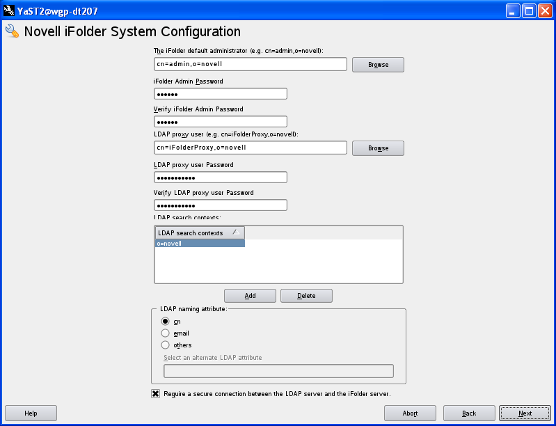 HINT:If the iFolder configuration failed at any stage, refer to the /var/log/YaST2/y2log file to find the details on the failure that help you in analyzing and troubleshooting the issues.