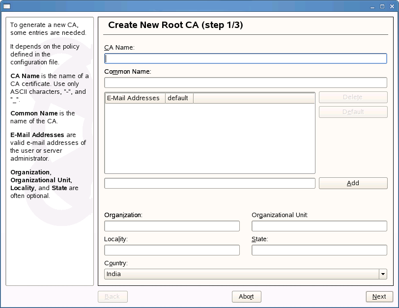Enter a password in the second dialog. This password is always required when using the CA for generating certificates. The following table summarizes the decisions you make.