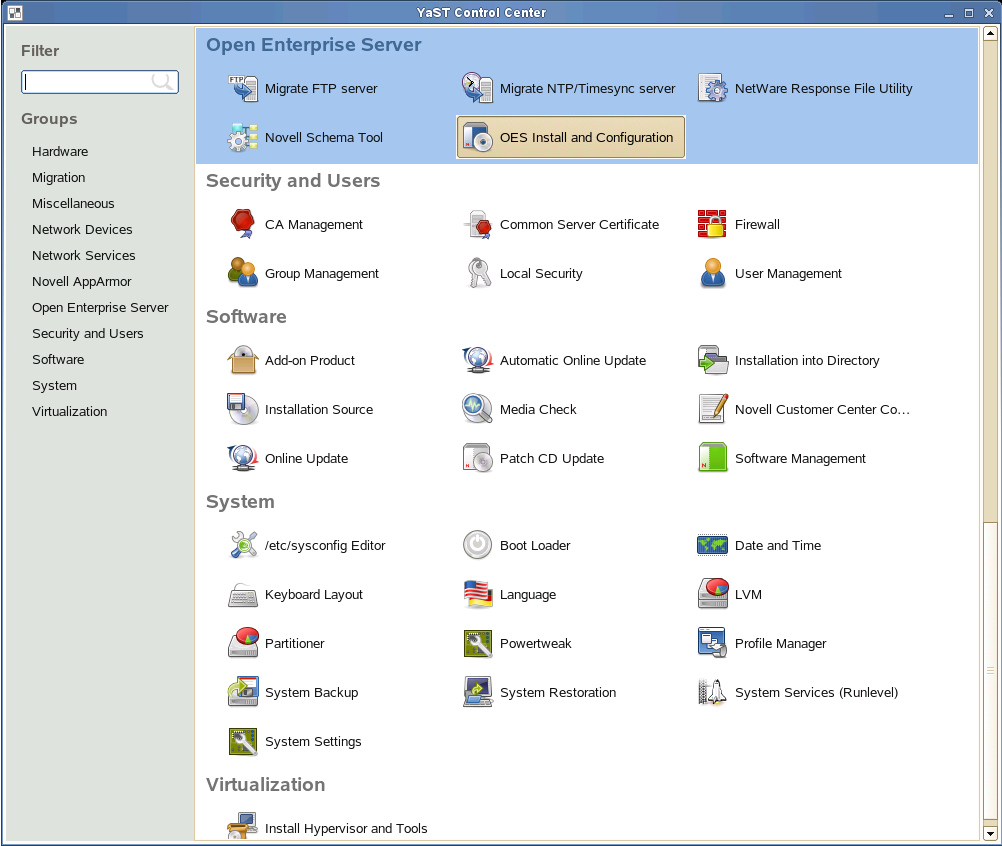 In the left menu, select Open Enterprise Server > OES Install and Configuration.