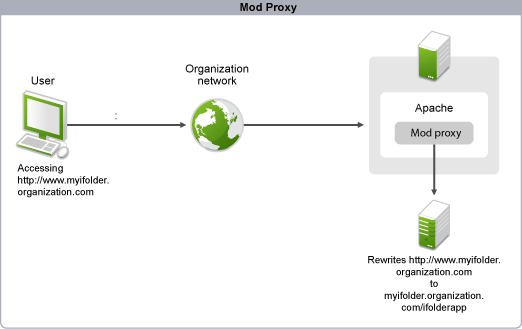 Mod proxy is a module used by the Apache server to implement proxying capabilities. It handles all the queries directed to it and forwards only the services that are configured to use iFolder. Mod proxy can be used when an iFolder server is maintained internal to an organization as an application server and is not exposed to the external network. The figure given below illustrates how mod proxy can act as a gateway to the requests directed from the external network by obtaining the required information from the internal iFolder application server.