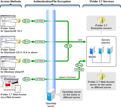 The iFolder client is available for Linux, Macintosh, and Windows desktops. Web Access server for Novell iFolder provides a Web interface that allows users to access their files on the enterprise server through a Web browser on any computer with an active network or Internet connection.