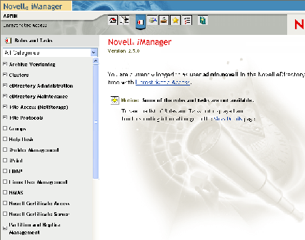 New in iManager 2.5 is the Category selector, which provides groups of roles and tasks specific to a particular function. Categories include the following: