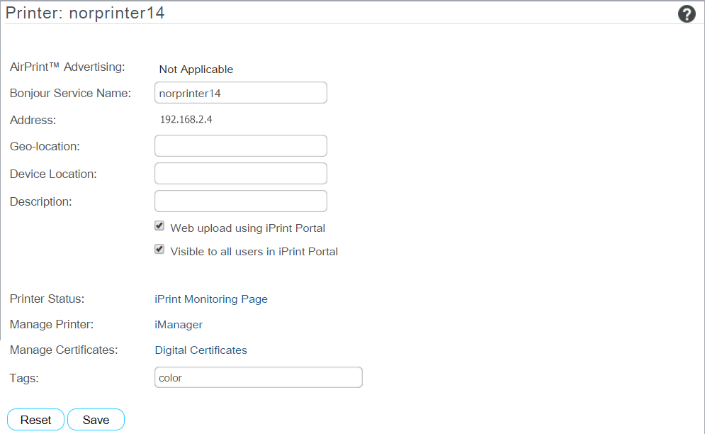 Tags: Specify a label for the printer. Multiple printers can be grouped under same label. In the iPrint Portal, it will be easier for the users to find a specific set of printers. For example, if you specify a tag as Color Printer. In the iPrint Portal, a user can easily locate specific printers by selecting the Color Printer tag.