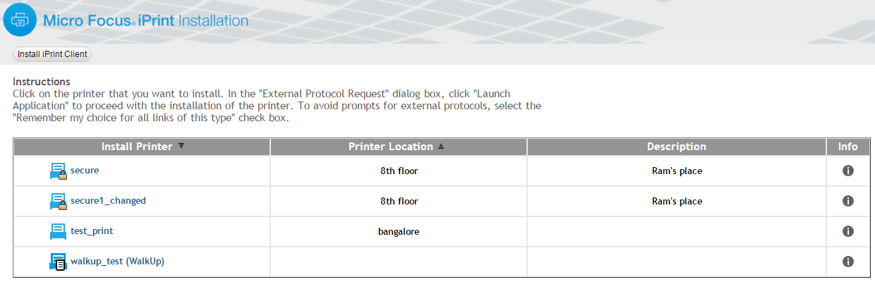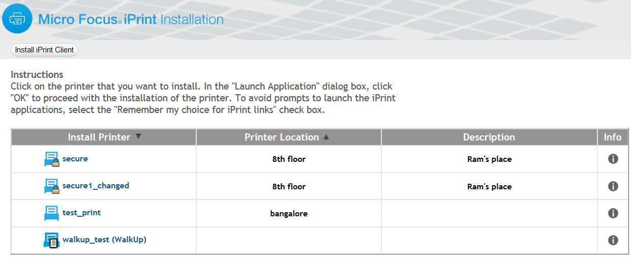 When installing a printer if the iPrint Client is not installed, you will be prompted for installation. You can install the printers in a variety of ways:
