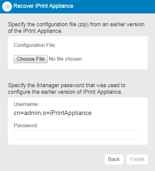 You can recover iPrint Appliance using a configuration file (iprintconfig.zip).