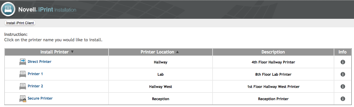 You can download and install the iPrint Client from the iPrint Printer List Web page that resides on the server where the Print Manager is loaded.