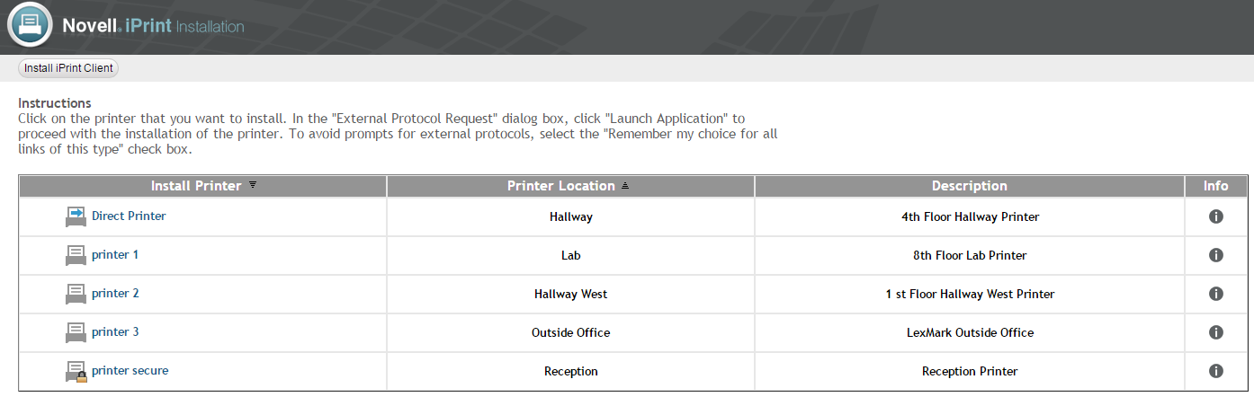 Launch the browser, and use either the DNS name or the IP address to access the iPrint Printer List page.