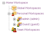 Initially, when you expand it, Personal Workspaces includes only two personal workspaces, even after you have created Teaming users, as described in Adding Users to Your Teaming Site