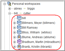 The /ssf/web/docroot/WEB-INF/classes/config/ssf.properties file contains a property called wsTree.maxBucketSize, which, by default, is set to 25. This means that the maximum number of sub-workspaces allowed is 25. If a folder or workspace has more subplaces, Teaming creates virtual buckets called pages. Each line in Figure 1-3 corresponds to a page. The Personal workspaces workspace has two pages.