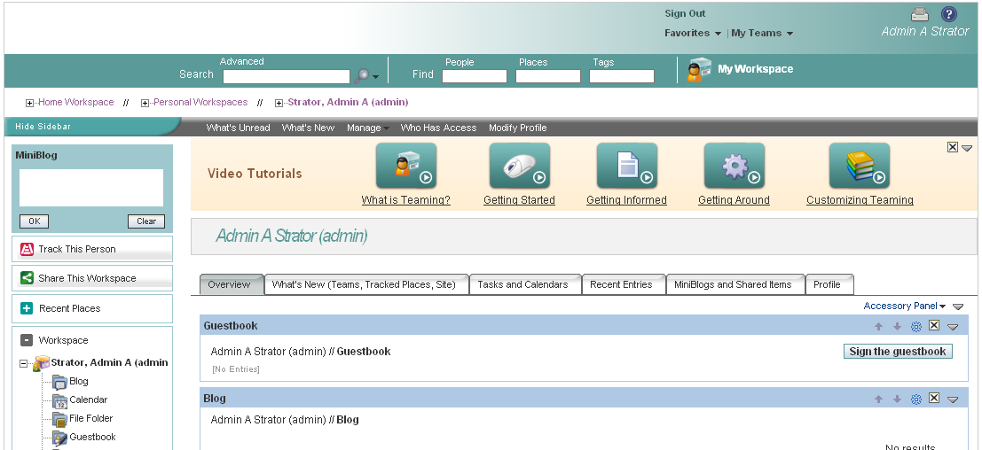 The personal workspace for the Teaming administrator appears.