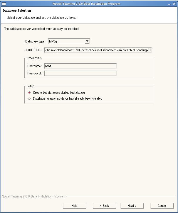 You or your database administrator must set the database server password when you install MySQL, because the Teaming Installation program needs the database server password. When you perform a Basic installation, the easiest approach is to let the Teaming Installation program create the initial database for you. Specify the database server password, then click .