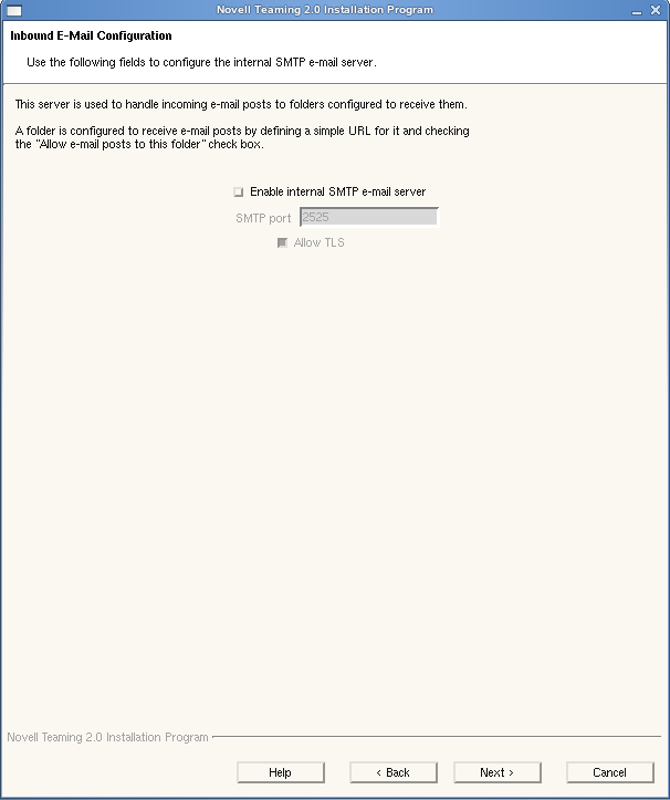 By enabling inbound e-mail, you enable users to post to Teaming folders from their e-mail clients for folders that have been configured with e-mail addresses. The default configuration information provided by the Teaming Installation program is typically appropriate, so you can enable inbound e-mail, then click .