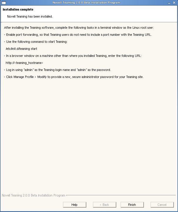 Log out as the Linux root user. Now, you can start Teaming. You are prompted for the password of the Teaming administrator user.