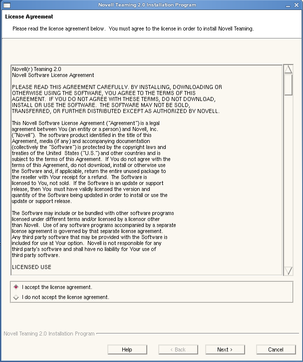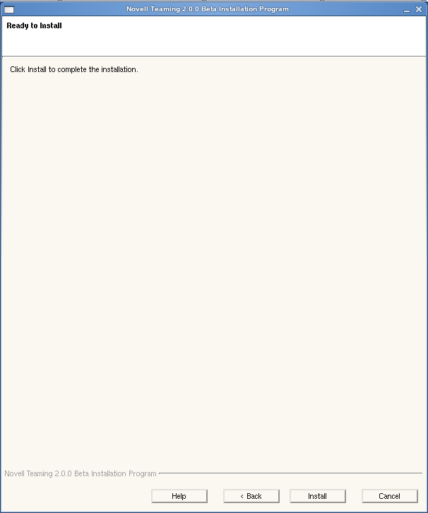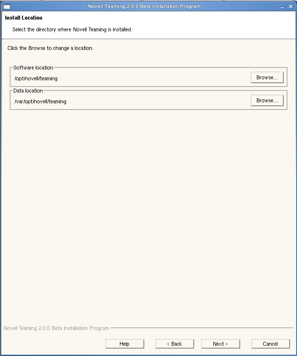 In a Basic installation, you can choose where you want to install the Teaming software and where you want to create the Teaming data store. The Teaming data store holds files that you import into your Teaming site, plus information associated with those files, such as thumbnails and HTML renderings, and the data search engine index. This means that the Teaming data store is a big consumer of disk space. In this demonstration, go ahead and click to accept the default locations of /opt/novell/teaming and /var/opt/novell/teaming.