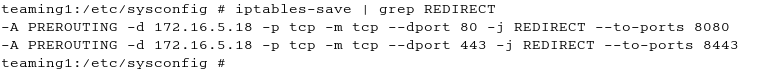 Next, you use the iptables-save command to show that the ports have been successfully redirected. On other types of Linux besides SUSE Linux, iptables commands can be used to accomplish the same result.