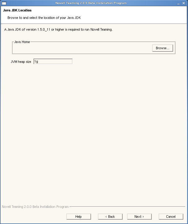 Unless you have already set the JAVA_HOME environment variable in the terminal window where you started the Teaming Installation program, you need to browse to and select the directory where you installed the JDK, then click .