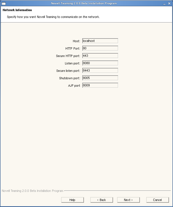 Ensuring that the network information is correctly specified is a very important part of the Teaming installation process. The hostname of the server where you install Teaming is required in order for other programs, such as the GroupWise® Windows client, to access the Teaming site. The HTTP port and the secure HTTP port are the port numbers that your Web browser expects to use when no port is specified in a URL. When you use the default HTTP ports of 80 and 443, users do not need to include the port number when they provide the Teaming site URL in their Web browsers.