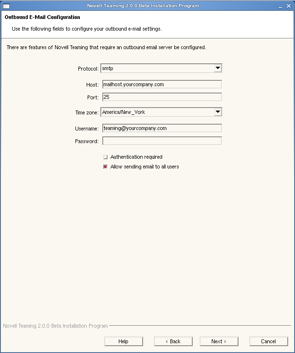 What you put in the and fields when you install Teaming depends on the requirements of your e-mail system. Authentication might or might not be required. Now, click to continue.
