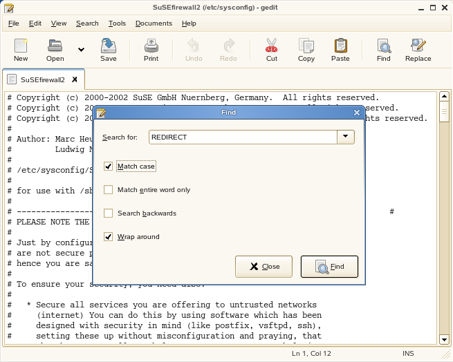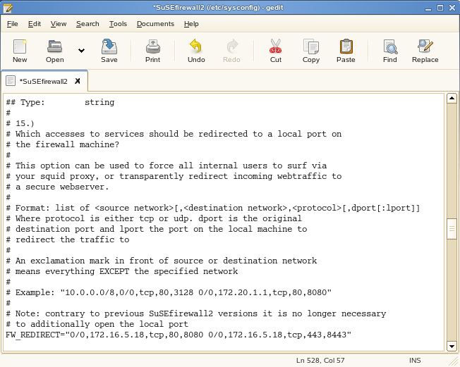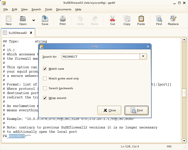 In the SuSEfirewall2 file, find the line you need by searching for REDIRECT. Remember to match the case.