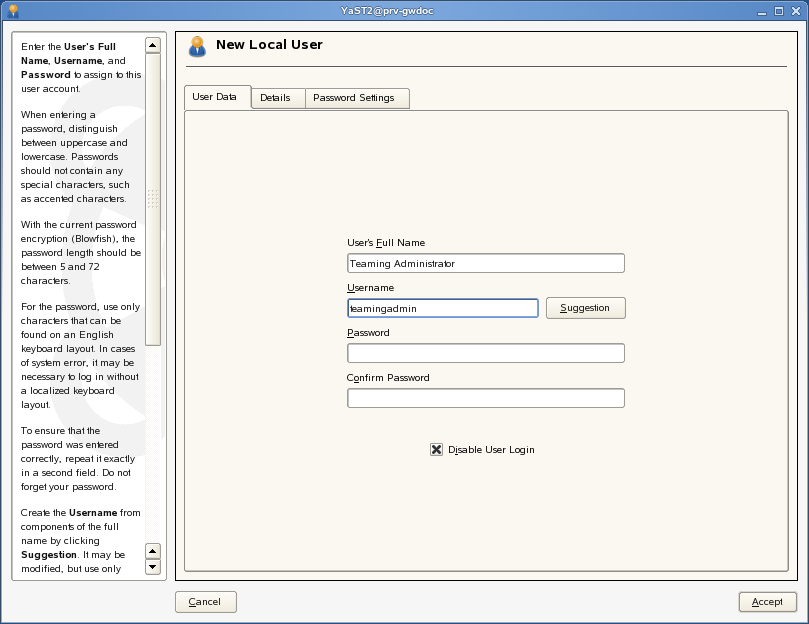 Next, you create the Teaming Linux user. This user should be configured with selected, because you want it to be like a system user. The Teaming Linux user does not need a password, but YaST requires you to provide one.