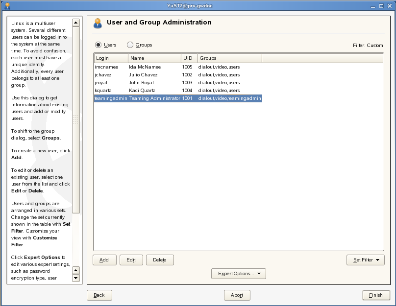 If you decide to create a user and group, it’s easiest if you create the Teaming Linux group first. The group does not need a password.
