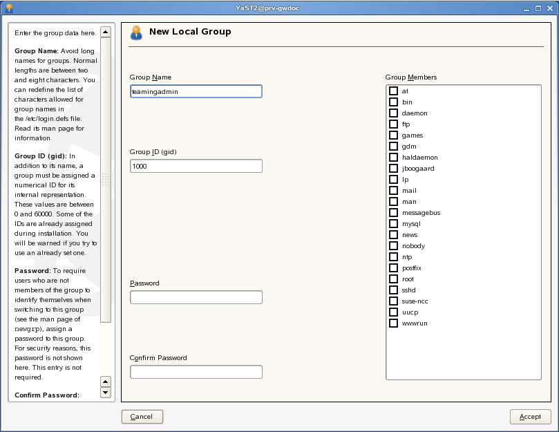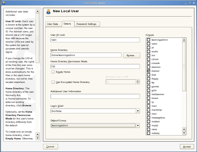 To make this user as much like a system user as possible, you need to change two settings on the tab. In the drop-down list, select , because you don’t ever log in as this user. In the Default Group drop-down list, select the teamingadmin group you created. Then click . YaST does require you to provide a password before it will add the user. You can avoid that annoyance by creating the user and group on the command line, if you’d prefer.