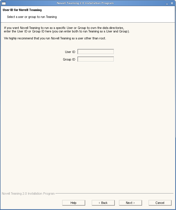 For security reasons, it is highly recommended that you do not run Teaming as the Linux root user. You might want to create a teamingadmin Linux user to run the Teaming software and a teamingadmin Linux group for this user to belong to.