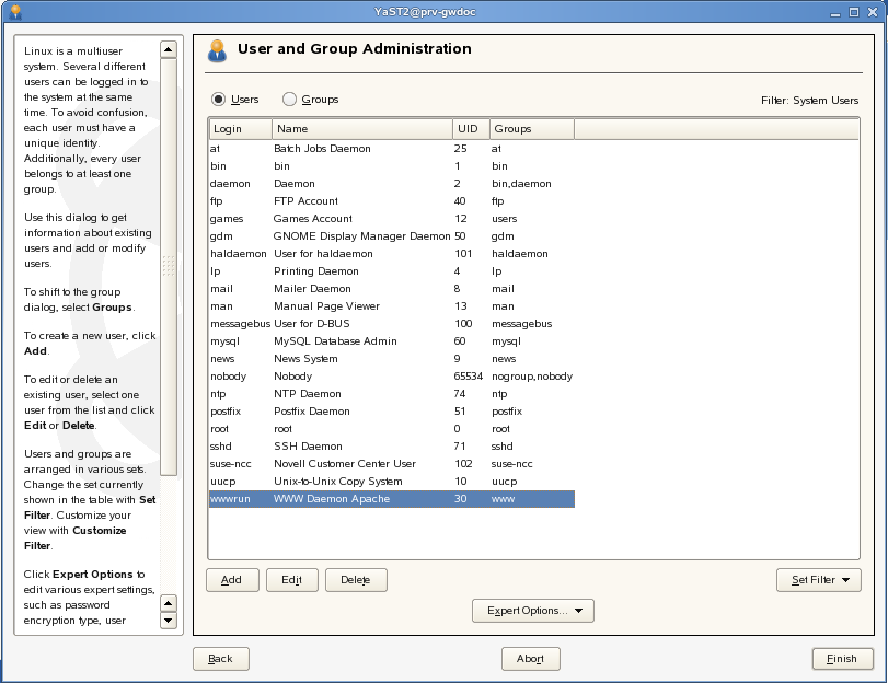 If you are familiar with the wwwrun user and the and the www group in SUSE versions of Linux, you can use those, rather than creating a new Linux user and group for Teaming. The wwwrun user is typically used to run the Apache Web server and is therefore a good candidate for running Teaming.