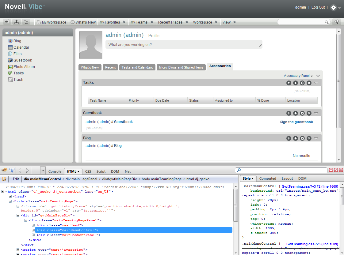 For example, suppose you want to modify the color or font of the Action toolbar for your Vibe site. You use Firebug on Firefox to find the selector name for the Action toolbar, which is mainMenuControl.