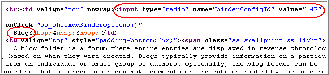 The following figure shows an example of the binder configuration information for a blog folder, as found in the HTML source for the page: