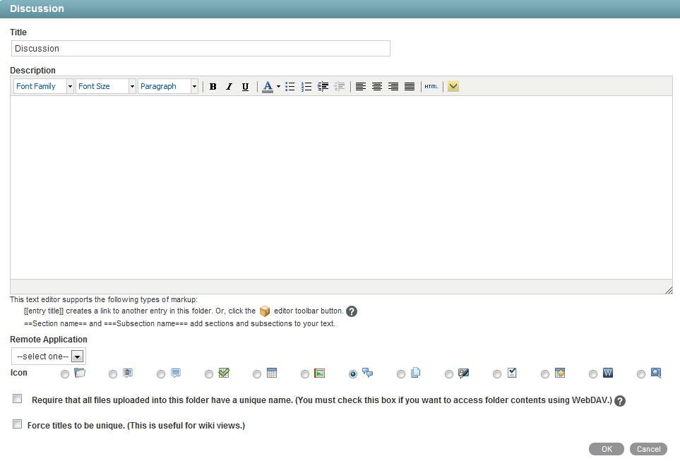For example, the form for a Discussion folder is what folder administrators see when they edit the folder by clicking Folder > Edit Folder. It looks like this: