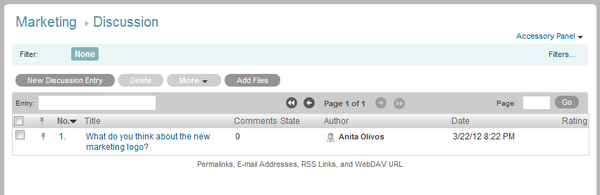 The view for a Discussion folder is what users see when they access the folder. It looks like this: