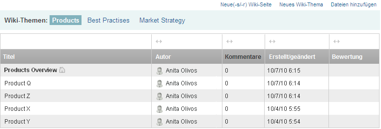 Sie können Ihre Wiki-Themen so organisieren, dass die Seiten nach , , oder angezeigt werden.