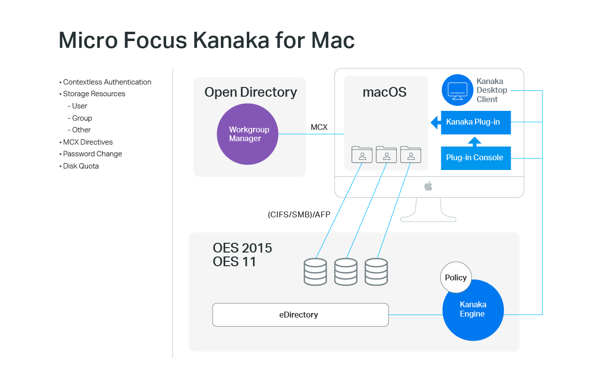 Micro Focus Kanaka for Mac provides macOS users automated single login access to NetIQ eDirectory storage resources through flexible login options. The Kanaka Plug-in component allows users to simultaneously log in to macOS and mount storage resources through a single username and password. The Kanaka Desktop Client allows users to access network storage resources after they have logged in as a local user to macOS.